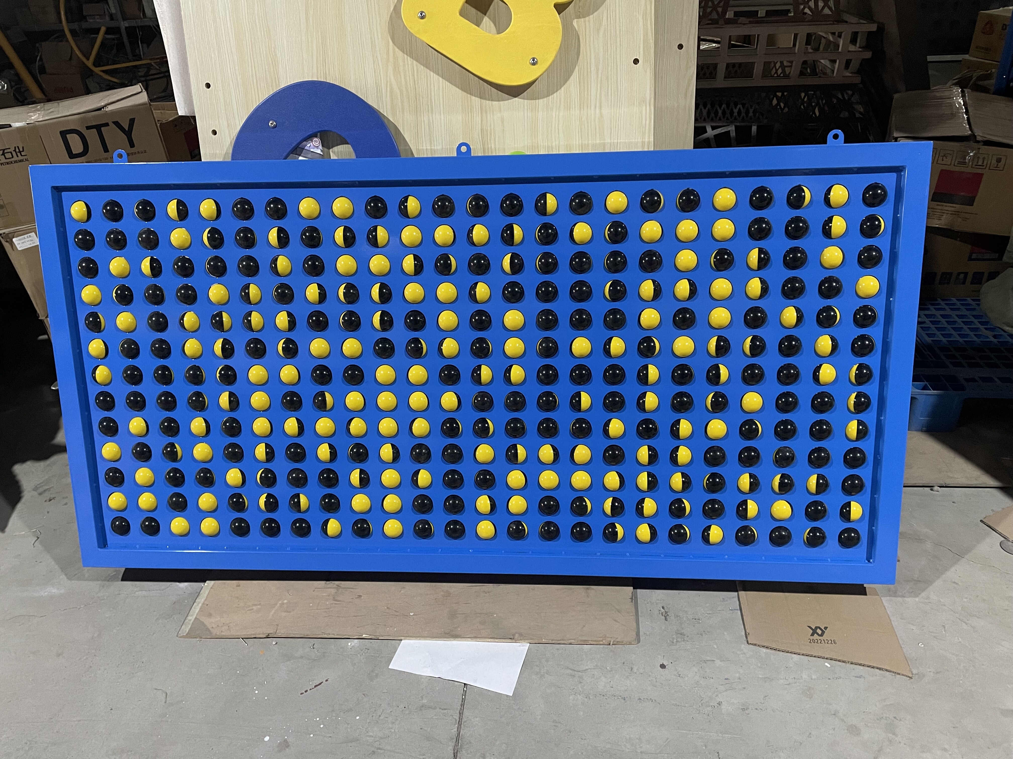 The Outdoor Interactive Flip Board Wall is an engaging play panel designed for public spaces such as parks, schools, and playgrounds. It consists of multiple sturdy, reversible tiles mounted on a wall structure, allowing users to flip them to create various patterns, images, or games.